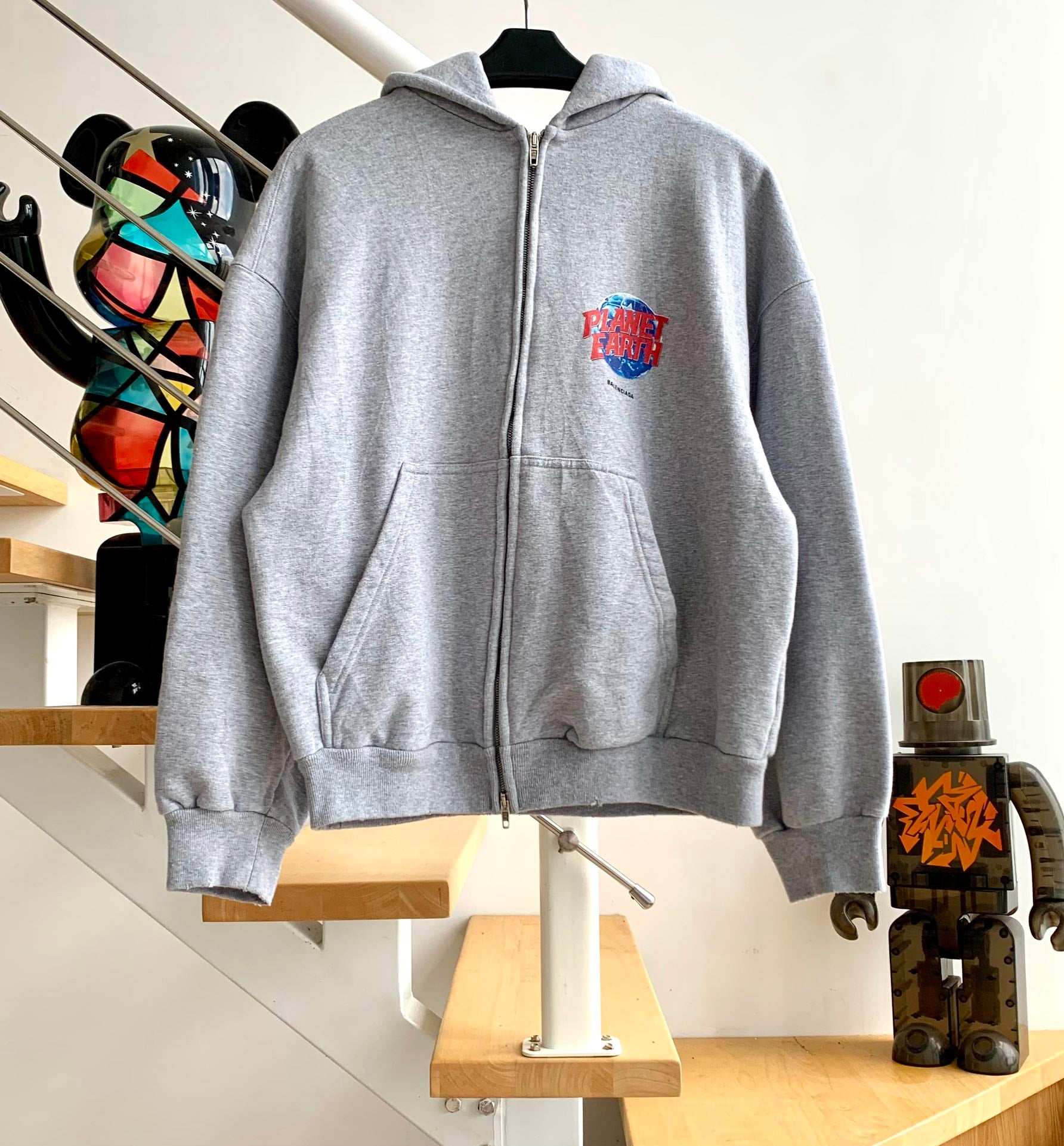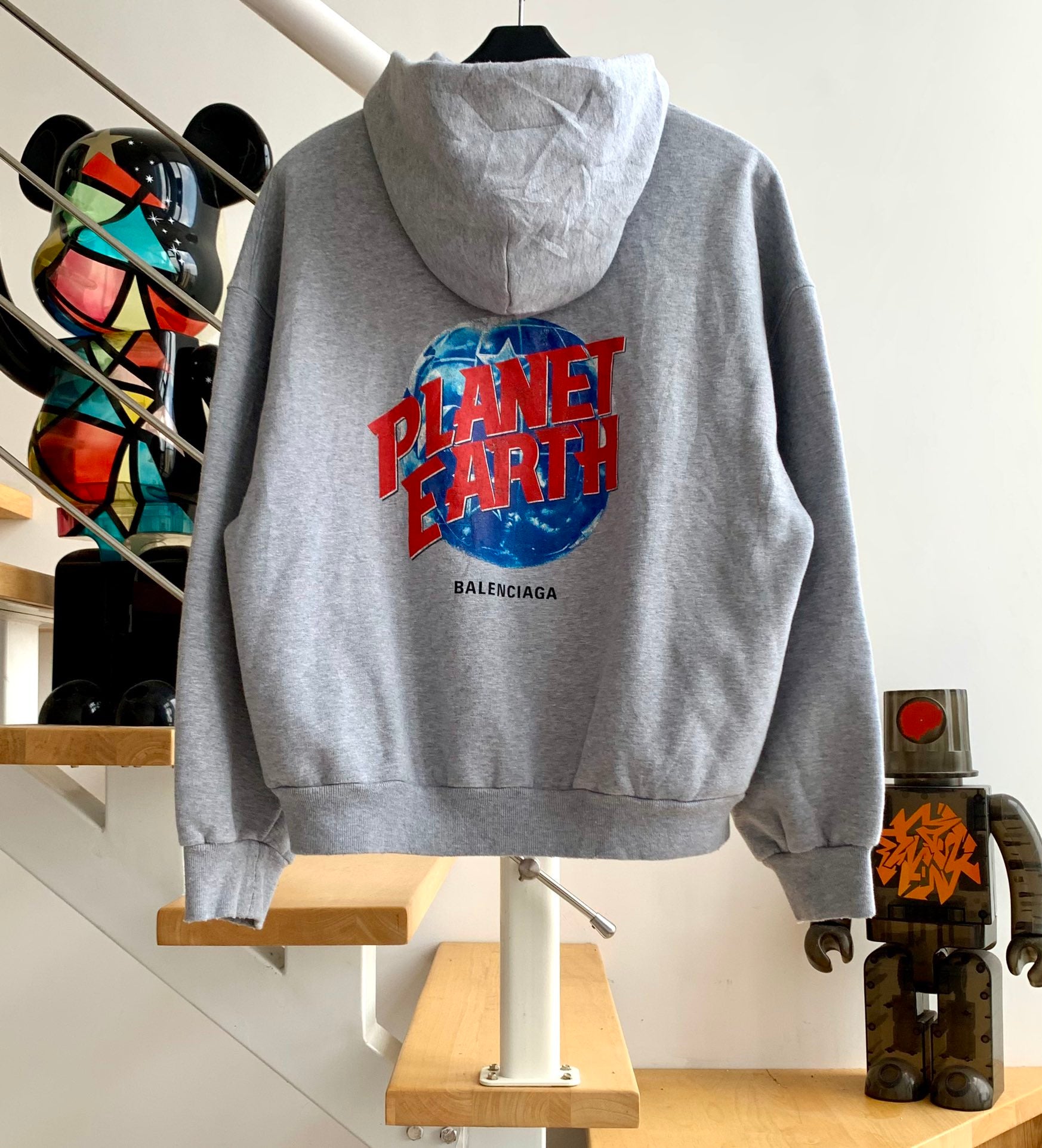 계단집/발렌시아가 남성 그레이 워싱 파괴 접힌 지구 프린트 후드
