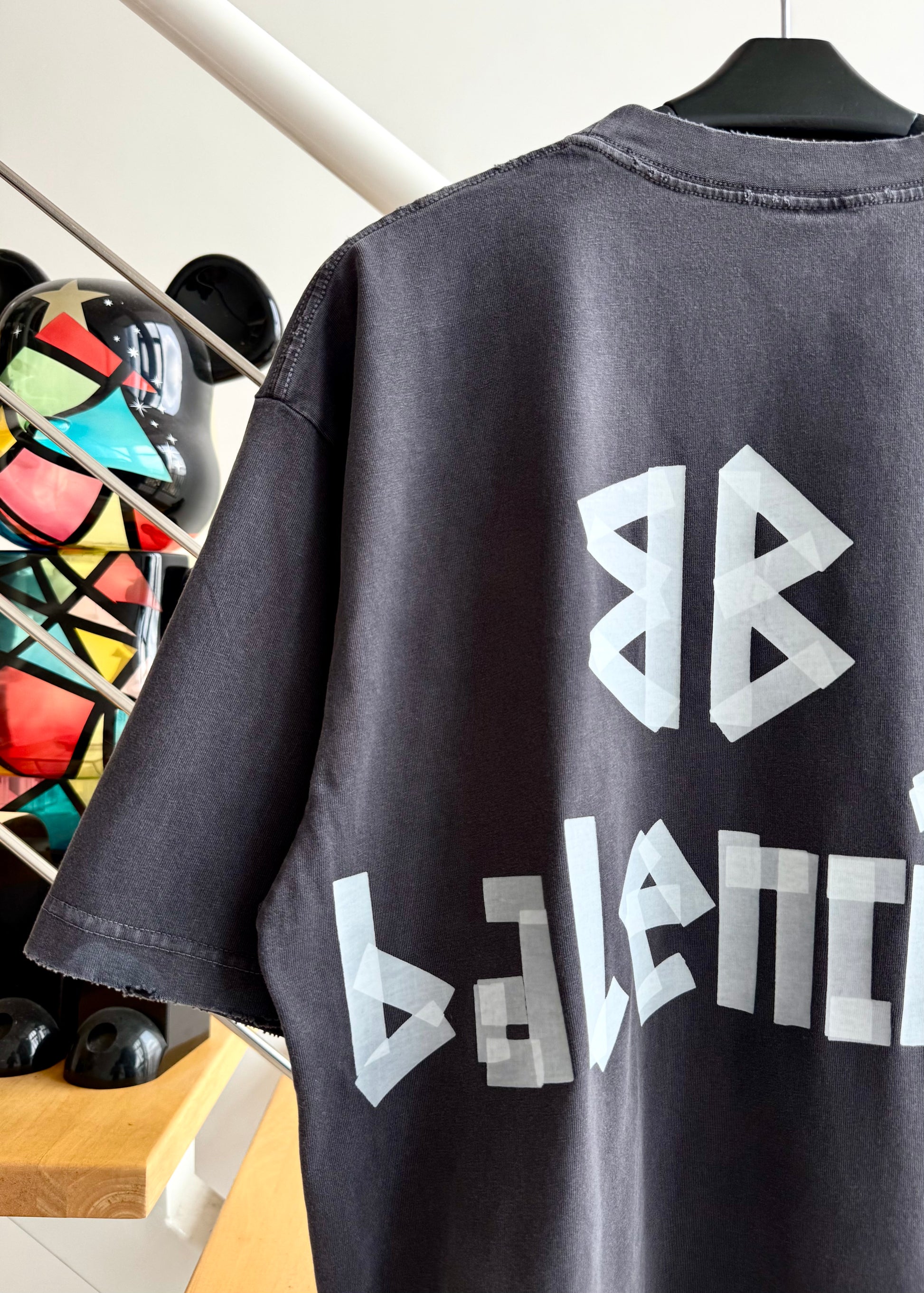 계단집 / 발렌시아가 반팔 , 워싱된 블랙 앤 그레이 테이프 워싱 데미지드 숏 티셔츠