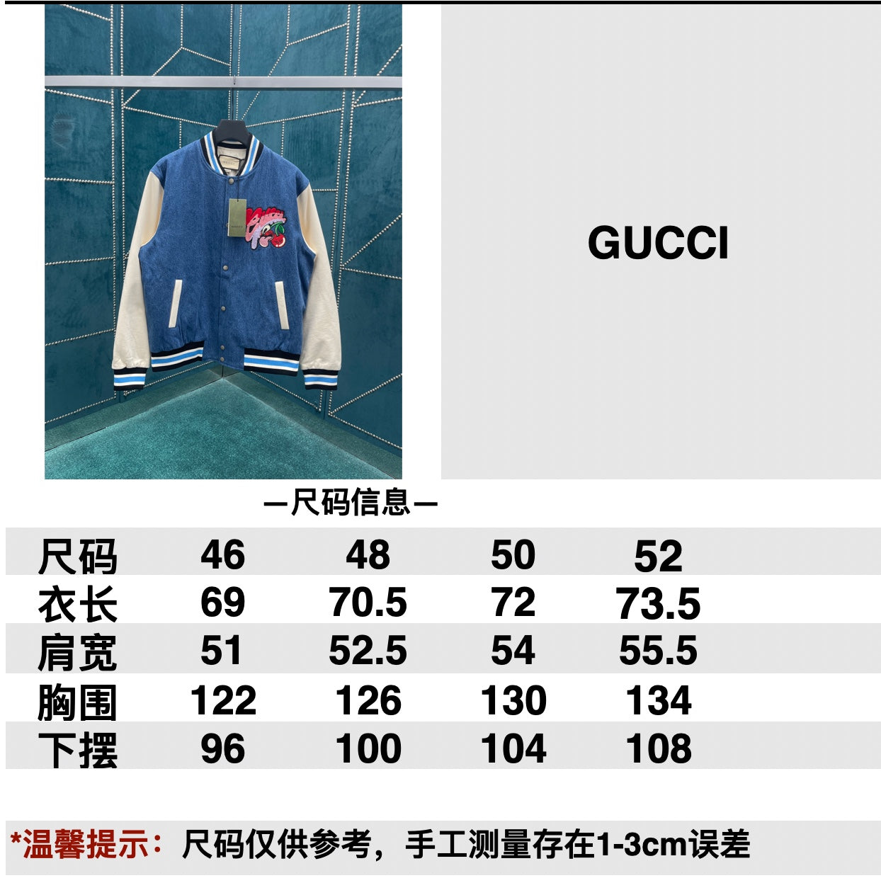 타일공장/구찌 신상 접합 블루 화이트 가슴 괴상한 체리 패치 야구 재킷 외투